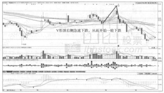股价在上升趋势中或者在上升加速期,突然开始下跌而且是连续下跌几根阴线,从高点快速下跌到低点附近,使得与上升趋势形成了一个倒V字形。下跌的原因可以是由突发因素引起的,也可以是毫无征兆、毫无原因的下跌。通常一般情况V形顶是一种转向形态, 也就是V形顶往往是头肩顶的头部,所以可以把它看成比较可怕的图形。