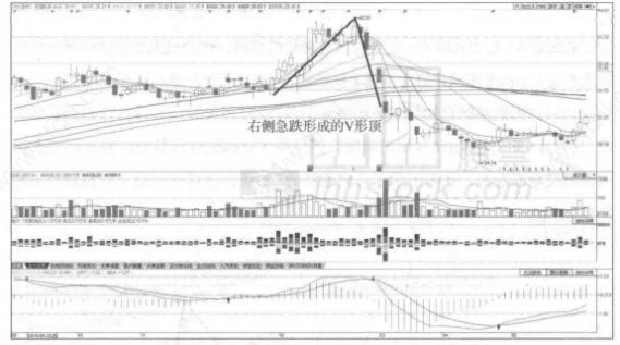右侧急跌V形顶有时不一定要在上涨趋势的顶部,也会出现在盘整区域。股价某几天毫无原因地上涨,之后快速下跌形成V形顶,从而开始一轮下跌。