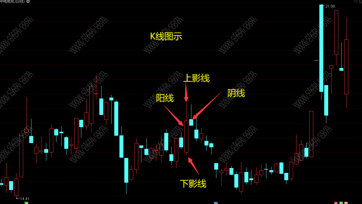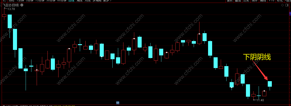 上影阴线:(上涨后跌型)先涨后跌,底部支撑力不大,在涨市中出现有可能是结束升市的信号。
