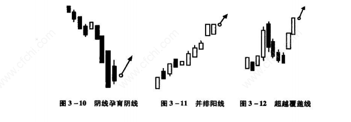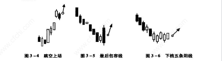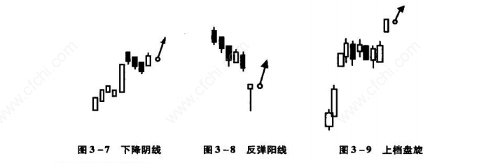 在涨升的途中,出现如右图般的三条连续下跌阴线,为逢低承接的大好时机。当第四天阳线超越前一天的开盘价时,表示买盘强于卖盘,应立刻买进以期价格扬升,如图3所示。