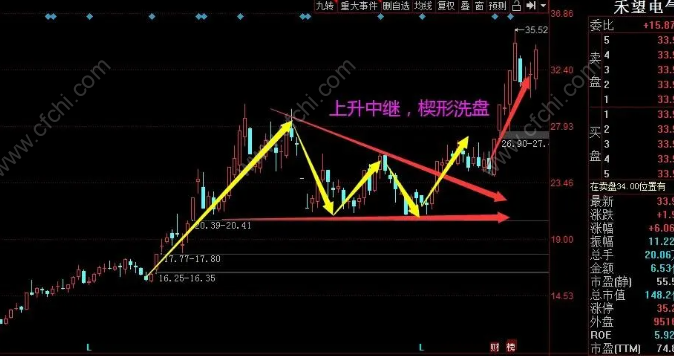 股票上涨不是一促而就的,往往是波浪上升的。通常上升趋势没有被破坏,股价滞涨时往往会把不坚定的持股者甩下车,这个时期也被大家称作“洗盘”。洗盘有多重形态,熟悉其中最常见的几种对我们的交易很有帮助,今天先给大家介绍楔形形态,如下图所示: