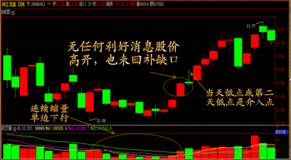 二、舍线腾空:是指在经过连续的缩量单边下行调整之后,在无重大利好消息的刺激下,股价突然大幅高开,一般当天收盘情况分为二种。