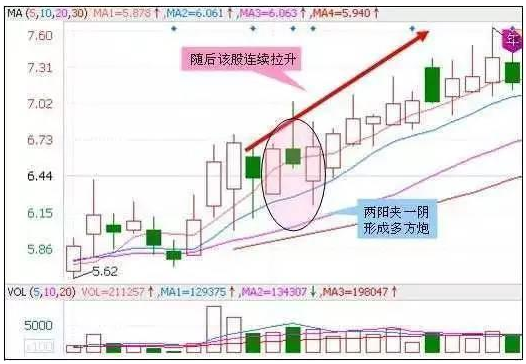 此K线组合上呈现两阳夹一阴的形态,还有以此演变出来的一种三阳夹二阴的图形,戏称为叠叠多方炮。