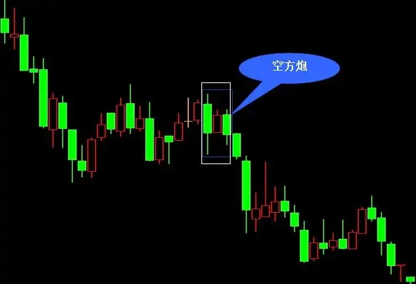 3.空方炮中的阴线可以是连续的小阳线或十字星,但最后一条阴线必须吃掉前面所有的小阳线。
