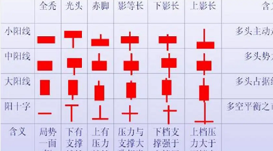 日线图K线的48种类型分为阳线24种和阴线24种,两者在形态上差不多,只是一为阳一为阴。阳线主要分为小阳线、中阳线、大阳线和阳十字星。