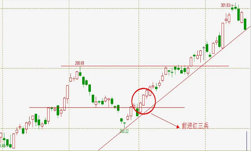 红三兵是一种很常见的K线组合,这种K线组合出现时,后势看涨的情况居多。尽管如此,但我们却很难给红三兵的K线组合形式下一个准确的定义。