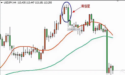 黄昏之星的情况同早晨之星正好相反,她是较强烈的上升趋势中出现反转的信号。黄昏之星的K线组合形态如果出现在上升趋势中应引起注意,因为此时趋势已发出比较明确的反转信号或中短期的回调信号,对于我们来说可能是非常好的卖入时机或中短线回避的时机。同时如能结合成交量的研判,对于提高判断的准确性有更好的帮助。
