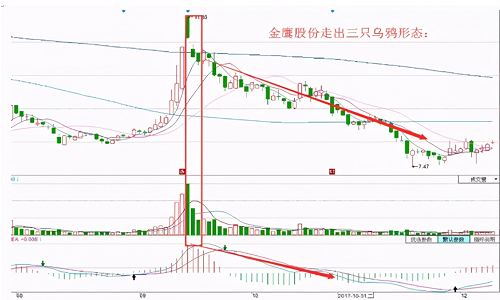 三只乌鸦是红三兵的反面“副本”,在上升趋势中,三只乌鸦呈阶梯形逐步下降,当出现三只乌鸦的组合形态,表明当前市场要么靠近顶部,要么已经有一段时间处在一个较高的位置了,出现此类K线形态一般表明股价后势将进一步下跌。