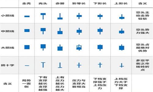 阴线主要分为小阴线、中阴线、大阴线和阴十字星。这四种类型根据阴线实体的大小和上下影线长短的不同每种也同样分为六种不同情形。阴线的实体越大,表示卖盘越强,一般后市会跌。下影线越长说明买盘越强,后市一般会涨,上影线越长说明卖盘越强,后市一般会跌。具体如下表: