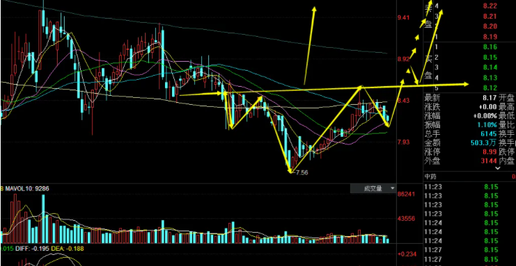 4、经过压力线附近,一段时间的盘子后,长阳线向上突破,成交量增加,低级继承人,激励买方,股价再次上涨。