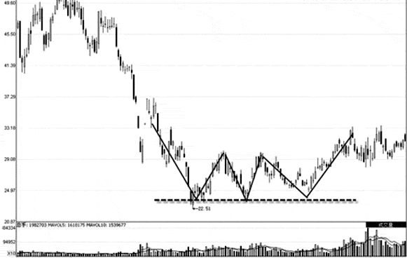 三重底是三重顶形态的倒影,在跌市中以三个相近的低点形成。在价格向上摆动时,发出重大转向讯号。与三重顶相比,三重底图形通常拖延数月时间及穿破阻力线才被确认为三重底图形。