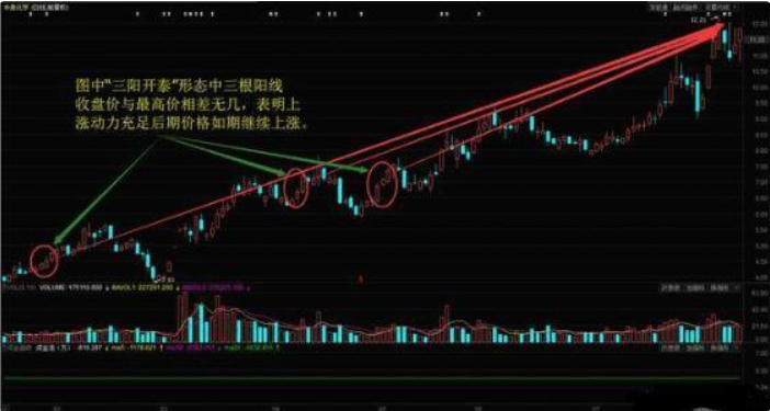 三阳开泰,在生活当中,广泛是指三阳生于夏,冬去春来,阴消阳长,有吉祥之象。常用称颂岁首或寓意吉祥。而在股市当中亦是如此,其含义是指当股价在低档经过较长时间的整理之后,连续走出三根小阳线,形成"红三兵"走势。这是一波行情启动的信号,股价将向上扬升,故称三阳开泰(见下图)。