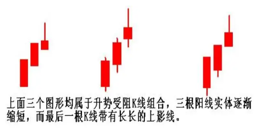 底部红三兵之后的走势,底部红三兵以后的形态红三兵由三根阳线组成,每日收市价都高于前一天的收盘价。武士勇往直前的精神跃然纸上,市场趋升的形势明朗化表示可能见底回升。红三兵一般出现在见底回升的初期。升幅不大,动作缓慢但升势相当稳定。如果红三兵实体过长短期指标有超买迹象,应引起注意。成交量无太多变化,但在随后的突破橄升时成交量会成倍放大。假红三兵指的是出现失败形态低位的红三兵可能是弱势反弹的一种表现形式,大阴线之后的红兵要提防它演变为下降三角形或下降旗形。
