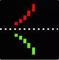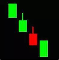 27.下降抵抗:卖出信号,后市看跌。出现在下跌途中,连续跳低开盘,即使中间收出阳线,但收盘价仍比前一根K线的收盘价低。