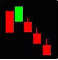 24.高位五连阴:见顶信号,后市看跌。出现在上涨途中,先拉出较有力的一根阳线后,出现由5根以上的并排小阴线。