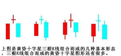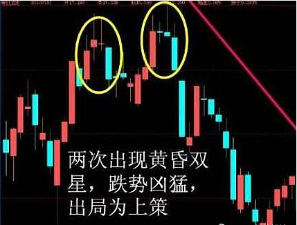 19.黄昏十字星应用法则:1、黄昏十字星的判断法则与黄昏之星相同。2、黄昏十字星比黄昏之星更具有趋势停顿或反转的研判意义。