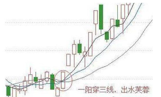 6.出水芙蓉应用法则:一根大的阳线上穿三条均线,改变均线为多头排列,后势看涨。