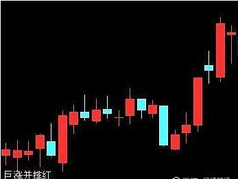 21.剧涨并排红应用法则:剧涨并排红(并列阳线)--也称为"并列阳线K线、两阳线跳空平底"。本形态是由两根相邻的阳线K组成的,它们具有相同的开市价。它们的实体也具有差不多相同的高度。在上升趋势中,如果出现了一组向上跳空的并列阳线,则构成了一个看涨的持续形态。