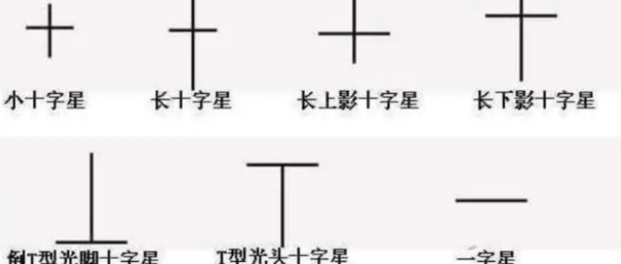 根据实战经验,十字星大致可以分为以下几种:小十字星;大十字星;长下影十字星;长上影十字星;T型光头十字星;倒T型光脚十字星和一字线七类,如下图:
