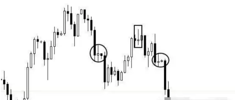 图中我们用圆圈标注的为固十字星,用方形标注的为反转十字星。可以看出,在整固十字星出现后行情并没有展开反转而是继续按趋势运行;当出现反转十字星后原趋势失去动力并逐渐地转向。