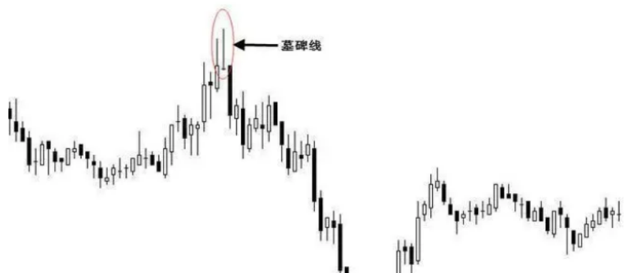 墓碑线从形态上看开盘价等于收盘价或者极为相近,上引线较长而下引线没有,或短到几乎可以忽略。
