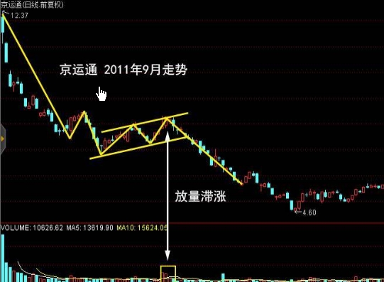 (2)与上升旗形具有“高效的洗盘效应”相反,下降旗形具有“高效的诱多效应”。这是因为下降旗形形成的初期的反弹,成交量迅速放大,投资者会认为是进场的好时机。其次下降旗形形成的短暂上升通道再次成为绞杀多头的陷阱,部分投资者看到一次又一次的新高和抬高的底部便纷纷进场,其实此时的成交量明显不足以支撑上方的压力。