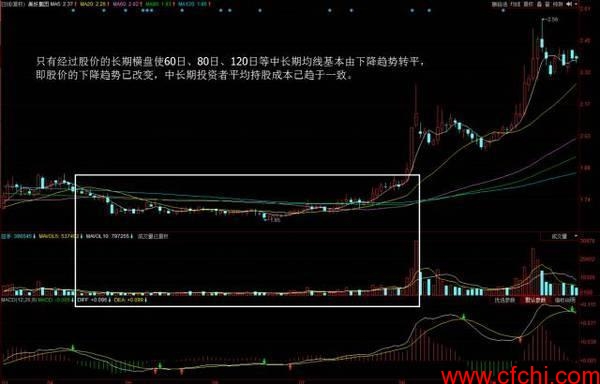 2、长期缩量横盘:只有经过股价的长期横盘使60日、80日、120日等中长期均线基本由下降趋势转平,即股价的下降趋势已改变,中长期投资者平均持股成本已趋于一致,这时股价才对新多头有吸引力: