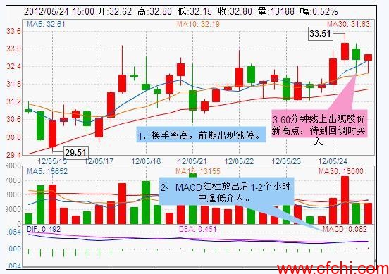 由于macd指标结合日k线研判不够准确,需要学会60分钟图!60分钟线股价突破近期最高点,企稳后反弹加上MACD指标金叉时进行买入,这是双保险。这两个指标相结合来判断有三个要点: