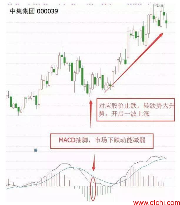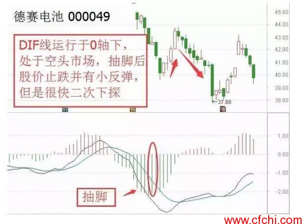 MACD柱状线在0轴下方,在股价下跌过程中,柱状线往往是发散向下,当下跌动能的绿柱达到最大,开始出现第二天柱子短于前一天之时,就是“抽脚”现象,说明市场下跌动力减弱。如下图: