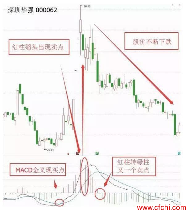 对比上图2个卖点,我们可以看出,在红柱缩短时的卖点对于收益保证是远大于红绿柱转换时的收益的,所以我们在对比买卖点的安全性之时,也要考虑收益空间,在实际操作中,要注意红柱缩短时量能以及均线配合的变化。