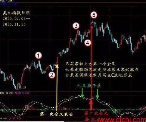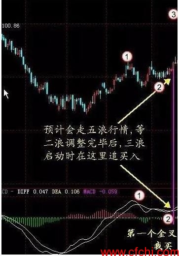 零轴上方的第一个金叉往往是第三浪的开始。那么为什么不买第二个金叉呢?因为后面的行情是无法确定的。第二个金叉一般都是第五浪的开始,而五浪相对复杂些,可能是衰竭浪,也可能是延长浪的。只买第一个金叉的思路就是相对确定性,放弃不确定性。