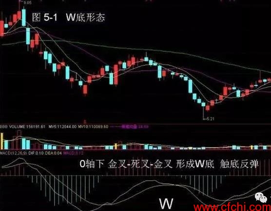 股价下跌行情中,在O轴线下,白线处于某一低点后向上,随后相继出现“金叉”,又出现“死叉”,其轨迹上在一个不同水平线上形成“W底”(双重底)的走势,当再出现“金叉”,既后(右)底出现时,预示见底反弹信号,可积极买入。