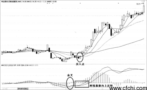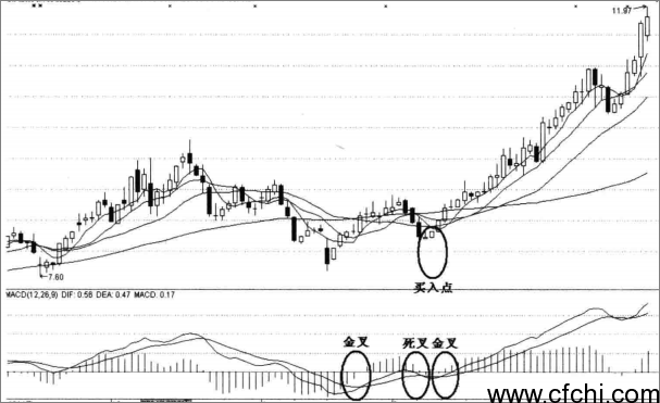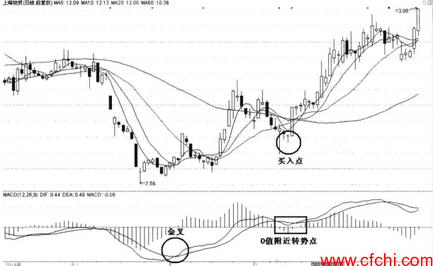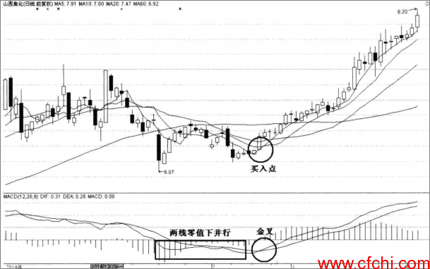 如图所示,DIF与DEA金叉后,随股价的上行而上行,而后,随股价的回调而下行。当主力洗盘时,股价回调,而DIF线回调到MACD线0值附近时,DIF线反转向上,使形成了金叉后上行下调再反弹形态,此时是买入的机会。