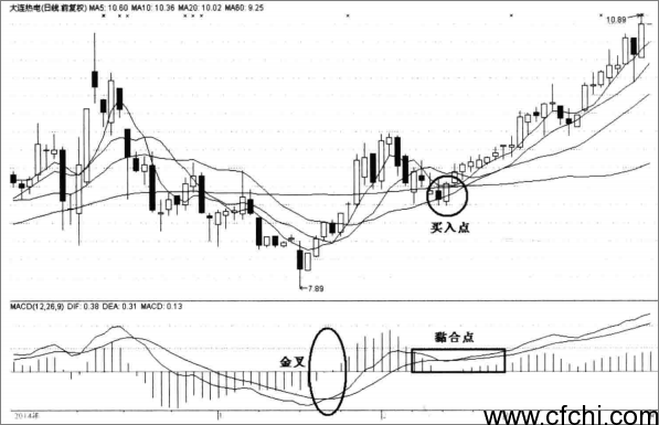金叉越轴线回调后两线黏合后分离指的是MACD指标中的DIF之前在零轴之下金叉DEA线,之后在零轴之上运行一段时间,然后随股价回调,DIF也开始向下回调。当DIF调到DEA线的时候,两条线黏合成一条线,当它们再次分离,多头发散的时候,形成买入时机,新的涨势开始(如下图)。该形态的出现多为上档盘整和主力洗盘所为,股价在上升途中作短暂的盘整后,呈现强势上攻形态,应理解为积极介入信号,果断买入。