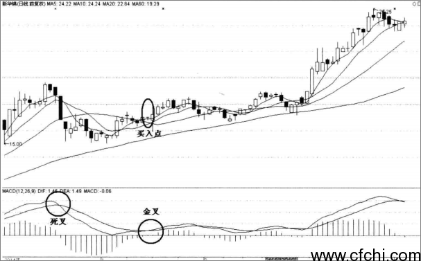 零轴下二次金叉指DIF在零轴以下产生的二次金叉(如图),表明该股打底完成,开始走出底部,可以择机介入。从下图中我们可以看到,该股在零轴以下产生两次黄金交叉,并且在中间还有一次死亡金叉,所以在第一个黄金金叉后要观察是否为真正的反弹,在出现死亡交叉后要谨慎进入,当出现第二个黄金交叉后,涨势已经确认,要果断买入。