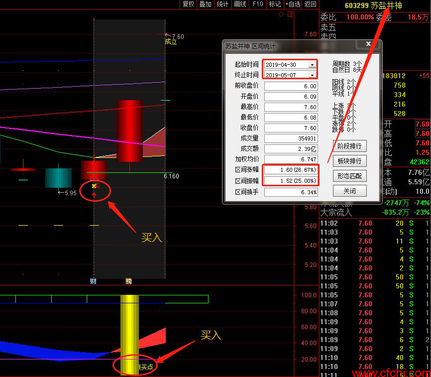 解析:经过一段时间的横盘整理,该股在24号出现了买入信号提示,果断买入,随后在副图上也出现了共振买入的信号提示,预示着后期有一定的涨幅,果不其然,7个交易日涨幅达到了80.06%!