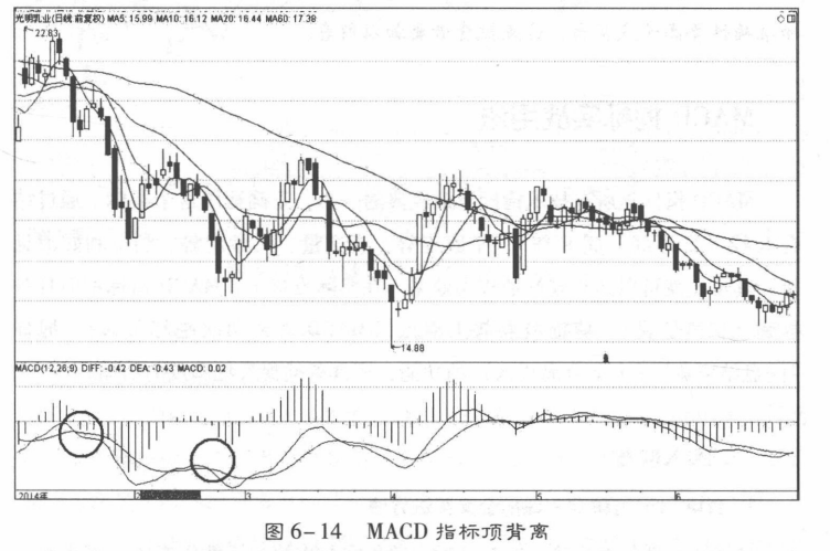 当股价K线图上的股票走势一峰比一峰高,股价一直在向上涨,而MACD指标图形上的由红柱构成的图形的走势是一峰比一峰低,即当股价的高点比前一次的高点高,而MACD指标的高点比指标的前一次高点低,就出现了顶背离(图6-14)。顶背离现象一般是股价在高位即将反转转势的信号,表明股价短期内即将下跌,是卖出股票的信号。