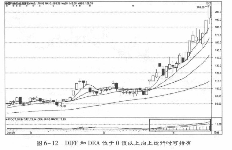 (1)当DIFF和 DEA 均大于0(在图形上表示为它们处于零轴以上)并向上移动时,一般表示为股市处于多头行情中,可以买入或持股(图6-12)。