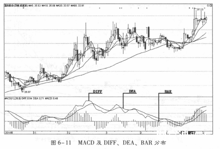 MACD指标的一般研判标准主要是围绕快速和慢速两条均线( DIFF和 DEA线)及红、绿柱线(MACD柱,BAR)状况和它们的形态展开(图6-11)。