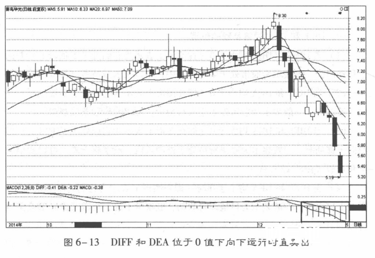 (2)当DIFF和 DEA均小于0(即在图形上表示为它们处于零轴以下)并向下移动时,一般表示为股市处于空头行情中,可以卖出股票或观望。