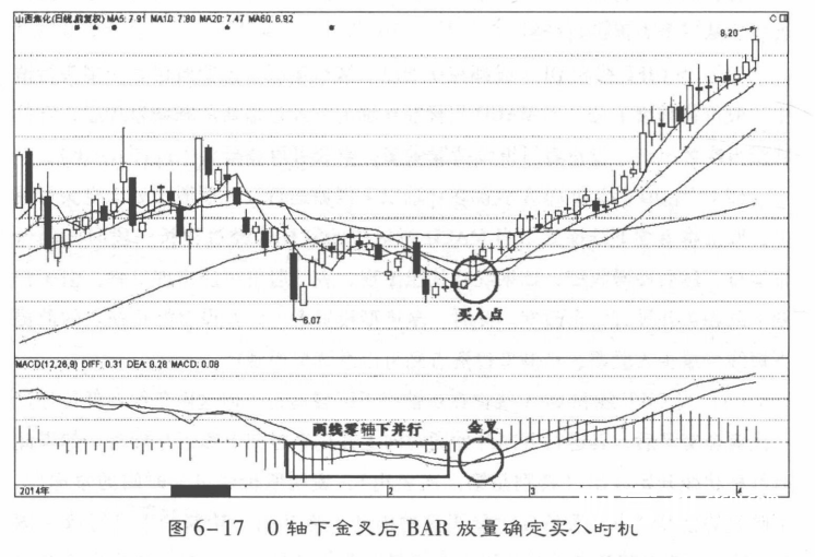 (3)当DIFF线和DEA线都在0轴以下区域运行,但这两条线在低位经过一次黄金交叉后,其运行方向开始同时向上并越来越向上靠近0轴时,如果此时红柱状线开始放出(特别是第二次放出),表明股价经过长时间的整理后,下跌趋势已经结束,股价在大量买盘的推动下将开始一轮新的上升行情(图6-17)。这也是投资者中长线买入股票的一个较好时机。此时,投资者应及时买入股票或持股待涨。