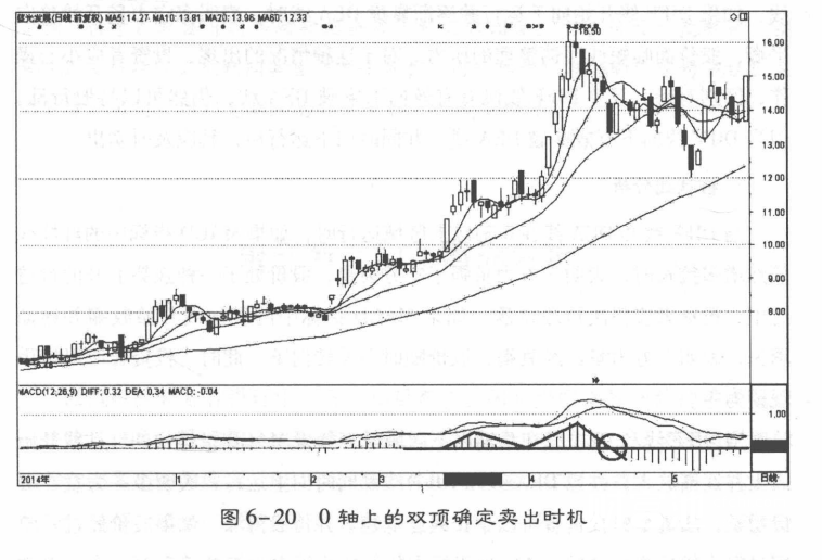 当MACD指标中的DIFF线和 DEA 线在0轴以上运行了很长一段时间后,红色柱状线构成一顶比一顶低的双顶形态时,表明股价的长期上升趋势可能结束,股价将开始一轮新的中长期下跌行情(图6-20)。此时,投资者应及时逢高卖出股票。