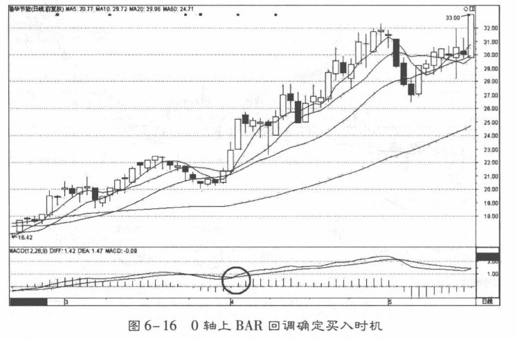 (1)当DIFF线和 DEA线都在О轴以上区域运行,说明股市处于多头行情中,股价将继续上涨。当MACD指标在0轴上方经过短暂的回调整理后,红柱状线再次放出时,投资者可继续持股做多,空仓者可逢低买入(图6-16)。