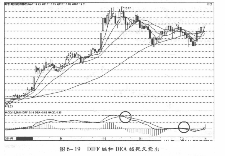 0轴以下区域的弱势“死亡交叉”表示股价在长期下跌途中的一段时间的反弹整理后,一轮比较大的跌势又要展开,股价将再次下跌,是短线卖出信号。它意味着下跌途中的短线反弹结束,股价的中长期趋势依然看淡,投资者应以逢高卖出剩余的股票或持币观望为主(图6-19)。