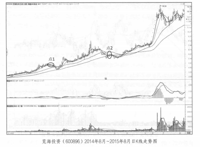 如图所示,览海投资(600896)的整个上升趋势都属于5178点牛市的黄金时期,如果是价值投资派做长线投资坚持持仓,整体的收益是非常可观的,但是如果用MACD的死叉或者零轴上柱体缩短找卖点就会导致在下图的点1和点2位置提前离场。