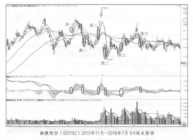 如图所示,融捷股份(002192)和览海投资的走势截然不同,融捷股份处于窄幅的调整期,此时作为趋势型指标的MACD可以说是完全失灵,下图中的三次操作机会是按照MACD金叉进场、死叉离场的要求进行的,可以很直观地看出在横盘状态下用MACD操作的失败程度。