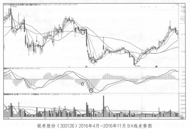 前期有过暴跌,空方动能得以充分释放,在零轴下MACD柱体开始变短时出现的买点才更有用。如果采用零轴下MACD柱体缩短进场的方式,像下图中锐奇股份( 300126)第一次出现这种情况时进场,就很可能踩上后期的暴跌,但是在暴跌之后出现柱体缩短时则是一个好的进场点位。