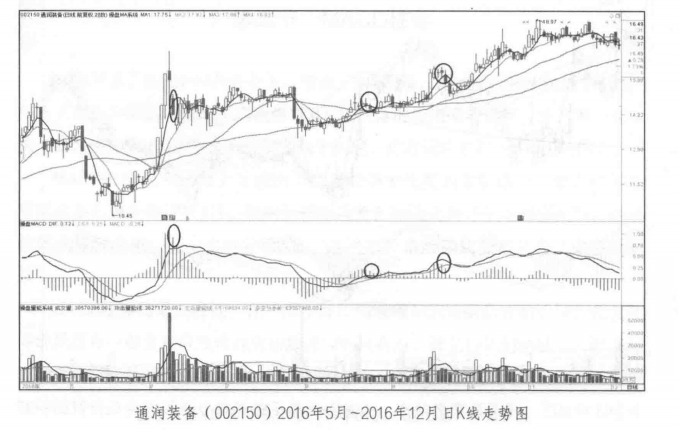 如图所示,在通润装备( 002150)的走势中,圈出了3处零轴之上MACD柱体缩短的位置。在第一处MACD柱体缩短时卖出是相对好的卖点,如果在前期低点买进,至少能够获得两个涨停板的利润。