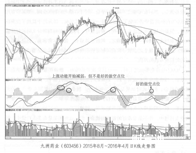 当DIF线在零轴之下运行时,零轴上的柱体的高度开始缩短时就是好的做空点位。值得注意的是,这虽是好的做空点位,却并不是多头卖出的点位,因为多头的仓位一定是在很久之前就平掉了。