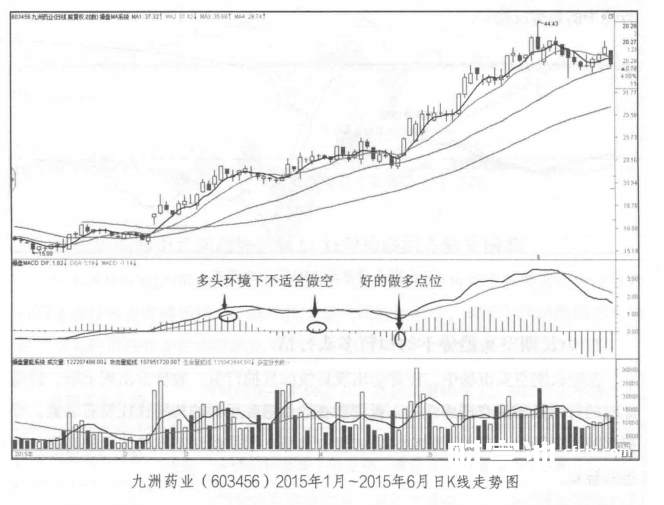 在九洲药业的另一段大多头行情中(见下图),当DIF线一直在零轴上方时MACD柱体在零轴之下,股价正处于调整阶段,当MACD柱体的高度缩短的时候就发出了交易信号。
